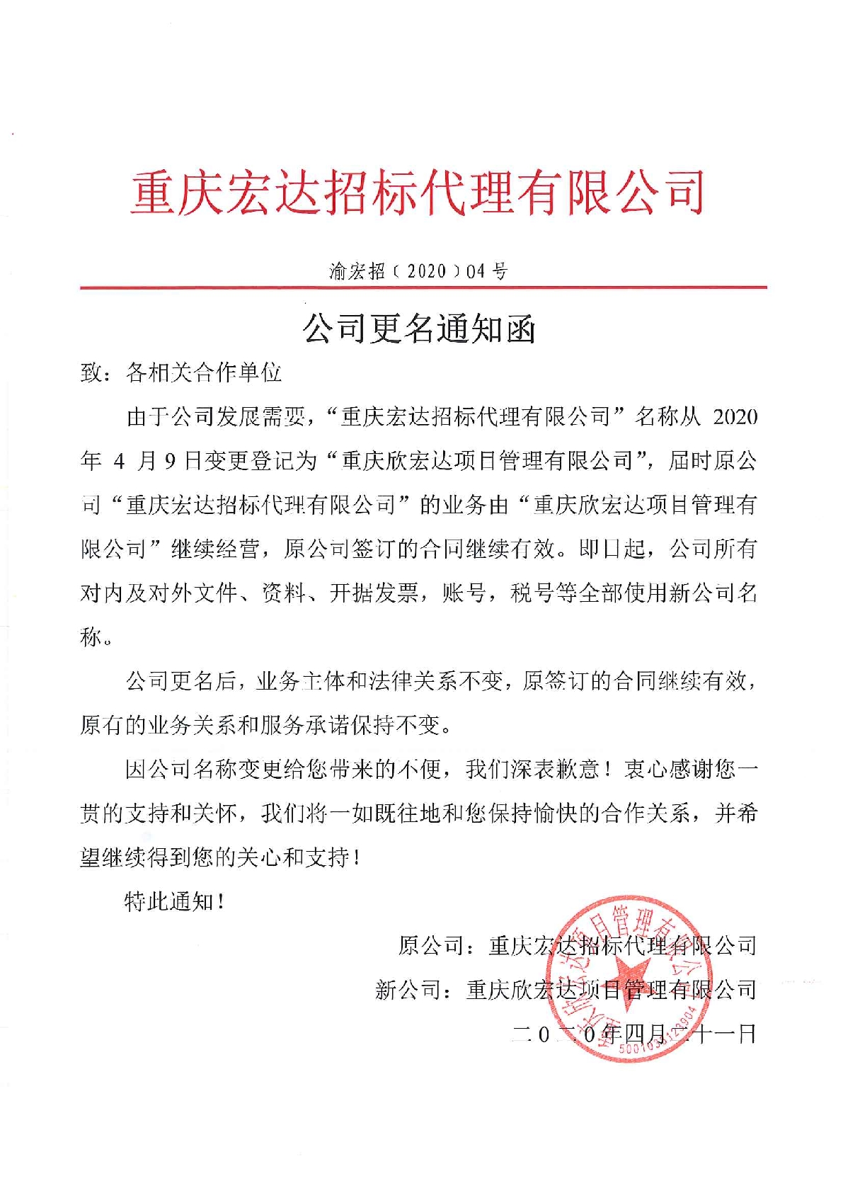 由于公司發(fā)展需要,“重慶宏達招標代理有限公司”名稱從 2020 年 4 月9日變更登記為“重慶欣宏達項目管理有限公司”,屆時原公司“重慶宏達招標代理有限公司”的業(yè)務由“重慶欣宏達項目管理有限公司”繼續(xù)經營,原公司簽訂的合同繼續(xù)有效。即日起,公司所有對內及對外文件、資料、開據發(fā)票,賬號,稅號等全部使用新公司名稱。 公司更名后,業(yè)務主體和法律關系不變,原簽訂的合同繼續(xù)有效,原有的業(yè)務關系和服務承諾保持不變。 因公司名稱變更給您帶來的不便,我們深表歉意!衷心感謝您一貫的支持和關懷,我們將一如既往地和您保持愉快的合作關系,并希望繼續(xù)得到您的關心和支持! 特此通知!